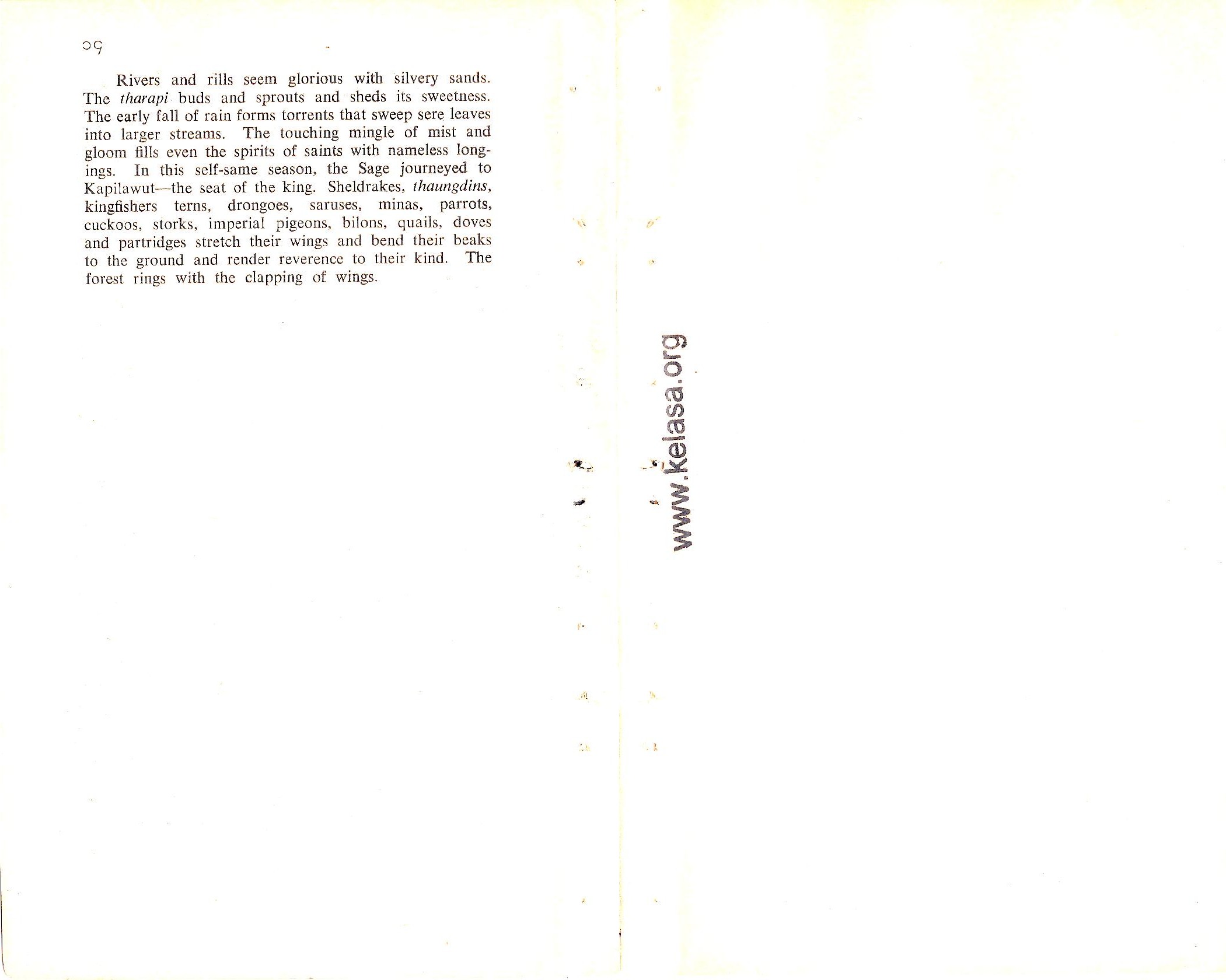 Literally Tawla means a journey through the forest. The sights and scenes along the journey are spiritualized and described in poetic language. But in Shin Uttamagyaw’s Tawla there is the added description of the different seasons and of the homage paid to Buddha by the whole realm of nature. The poem appears to owe its inspiration to the address by Shin Kaludayi (couched in sixty Pali stanzas) to Buddha suggesting a journey from Rajagaha to Kapilavasthu in view of the pleasant season.